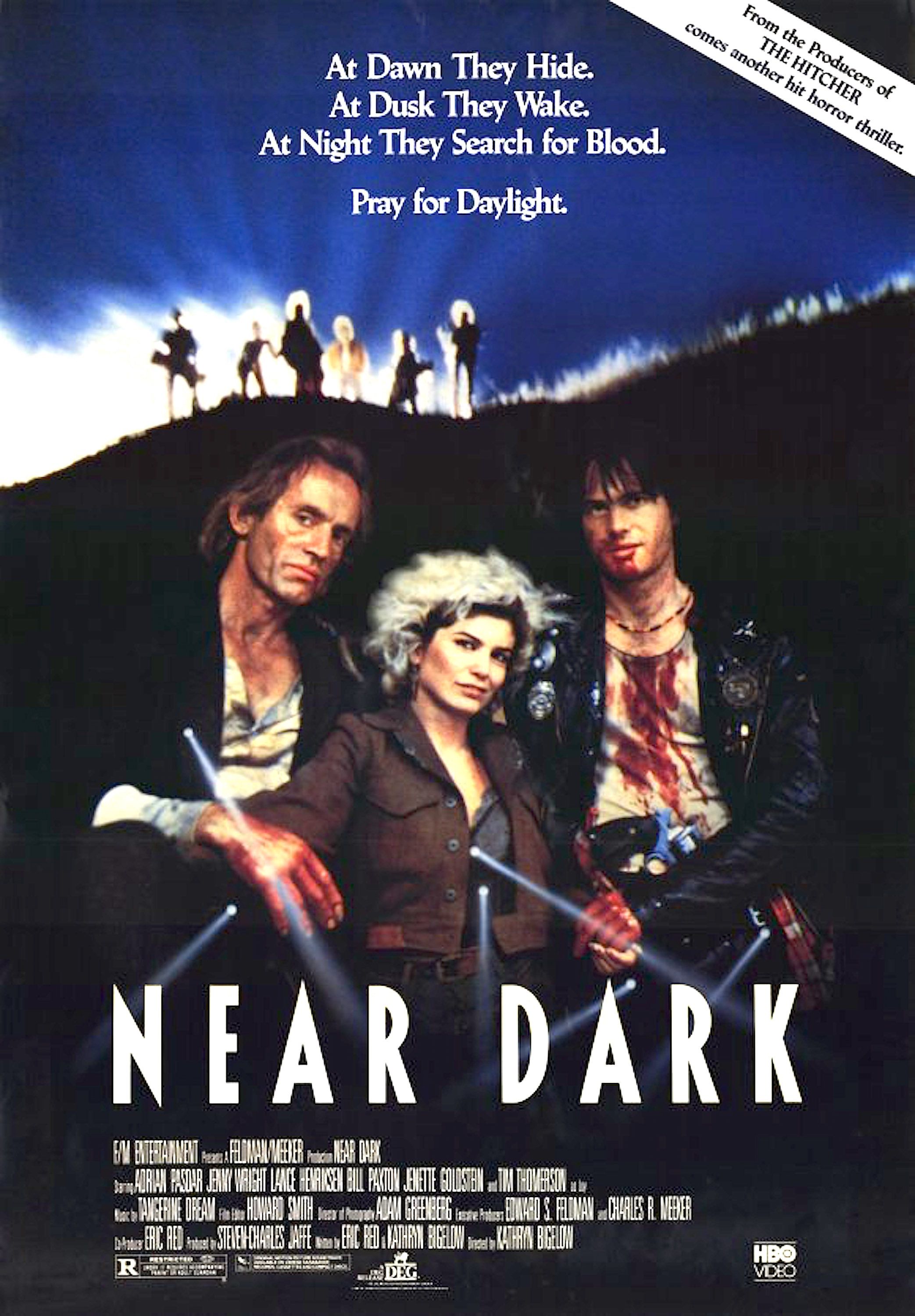 Nowadays, The Lost Boys remains fun as a contextual piece for the greased-up sax player, taxidermy gramps and tooled-up frog brothers, with a death-by-stereo thrown in for good measure. Released in the same year as Near Dark, both movies would depict vampires at large in a modern world and a main protagonist seduced by an infected mystery girl, but in terms of tone, pacing and directorial savvy, Bigelow’s moodier, messier effort is a far more unconventional and satisfying spectacle. Bigelow’s previous track record included co-directing a young Willem Defoe in The Loveless with Monty Montgomery in 1982. Subsequently, after spending some time in filmmaker limbo, her then agent Nancy Nigrosh paired her up with fellow newcomer Eric Red via Red’s agent Melinda Jason, whose previous screenwriting effort was The Hitcher, a bloody psychopath picture that featured motiveless murderer Rutger Hauer stalking C Thomas Howell’s naïve youth from bloody set-piece to bloody set-piece.