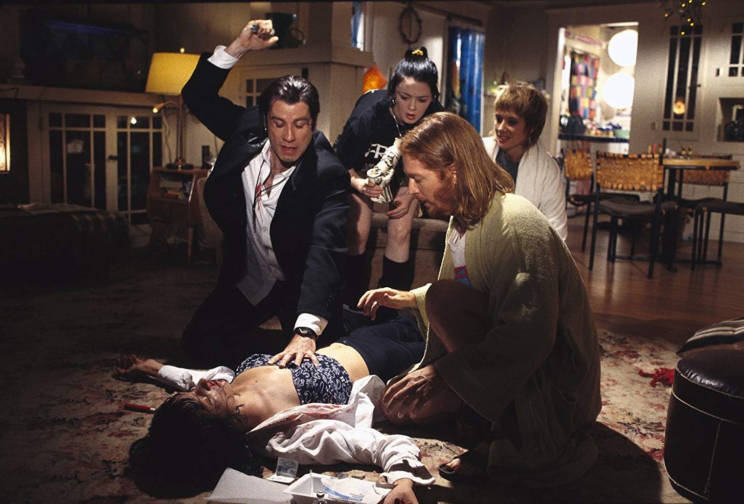 Dark stuff, but QT isn’t one to bog us down with realism, something that would become increasingly apparent when tackling subjects such as Nazi Germany and American slavery in a way that only he can. The director isn’t quite so fanciful here, or as self-satisfied, but as edgy and as excruciating as the scene is, it is alive with an electric undercurrent of humour, inspiring the kind of exhausted smiles that are as much from relief as anything. From the moment Vince finds Mia whacked-out on his personal stash, your heart is in your mouth, the ceaseless chaos that ensues the only thing preventing you from swallowing it. It’s an excruciating ordeal, from the frenetic phone call between Vince and Lance to the act of penetration itself, Jody’s insane outbursts as the group search a stoner’s domestic junkyard for a little black medical book only adding to the emotional frenzy. There’s nothing funny about the situation, it’s the way in which the characters react that leaves you smiling: the empty threats, the frantic foraging and general inadequacy in dealing with the situation. Once again we are presented with outlandish characters in outlandish scenarios, but we can identify with their human frustrations and petty quarrelling. We find humour where there shouldn’t be any.