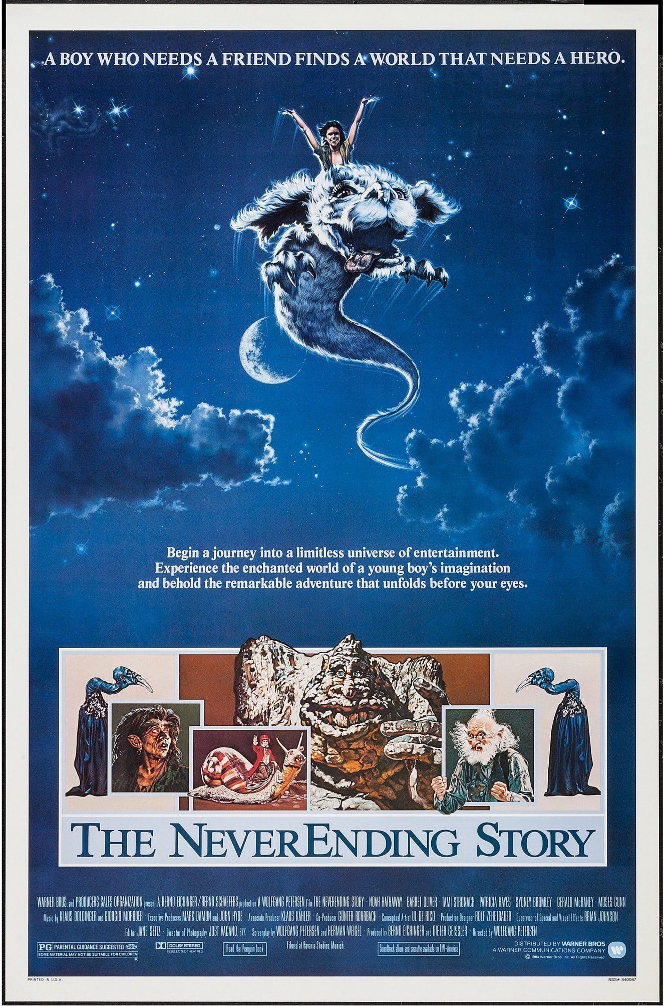 In 1984, Wolfgang Peterson would make The Neverending Story, his first full-length English language feature after the censor baiting shenanigans of his early years as a European auteur and the release of seminal, claustrophobic U-Boat movie Das Boot, which was nominated for 6 Oscars and lauded as a classic when released in 1982. The Neverending Story was filmed primarily in Germany at Bavaria Studios in Munich, with Warner Bros. taking on American distribution duties for the slightly shorter edit released in the USA, and was based on the first half of a children’s fantasy novel by Michael Ende called Die Unendliche Geschichte, released in 1979 to staggering acclaim. Ende, who was initially in favour of the adaptation, would quickly lose faith in the production and requested the title be changed, since the resulting film was thematically and aesthetically at odds with his work. He would go on record denouncing the film as ‘revolting’. He considered it a consumerist frivolity more concerned with making money than telling his story and would eventually file a lawsuit against the filmmakers, though was unsuccessful in court, in spite of his protestations.