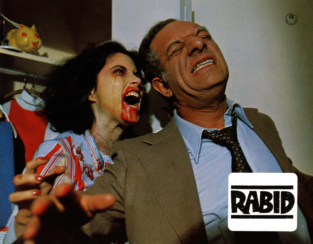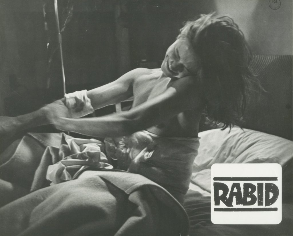 Rose hitchhikes to Montreal, infecting a truck driver along the way. She reaches her best friend Mindy’s apartment, where we learn through a news program Mindy is watching that a rabies epidemic has broken out among the populace. But this is no ordinary strain of rabies. It is immune to the standard vaccination, it has a shorter incubation period than rabies, and its victims are turned into violent, bloodthirsty savages. Doctors have traced the outbreak to the Keloid clinic, and they believe if they can locate Patient Zero, then they can use that person’s blood as an antidote.