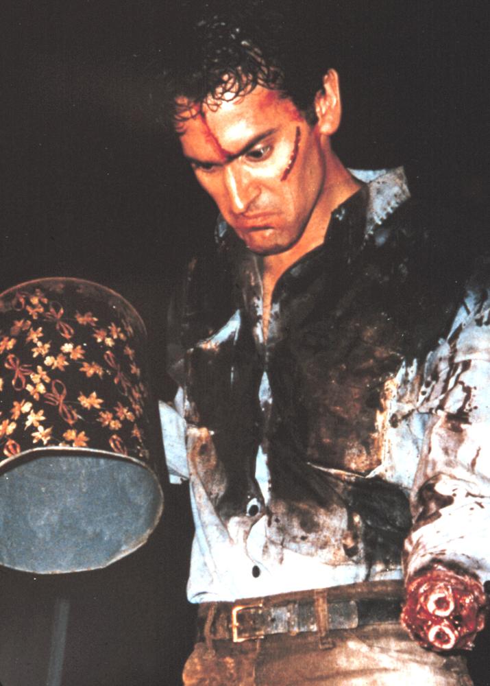 An increase in budget also meant Evil Dead 2 could up the splatter, makeup and special effects quota of the original by literally flinging as much (multi-coloured) blood and gore at cast members as was possible. Mark Shostrom assumed makeup duties, alongside KNB alumni Howard Berger, Greg Nicotero and Robert Kurtzman. Tom Sullivan, meanwhile, was responsible for animating the book of the dead during the film’s opening credits along with the flying deadite as the film nears its conclusion. Verne Hyde, on technical effects duties, would fashion a series of camera effects to achieve the dazzling array of shots Raimi required for the movie, including Ash being flown through the woods and the shot of the camera spiralling up into the trees following Ash’s landing. He would also assume responsibility for hosing Ash in blood and modifying Ash’s chainsaw so that it didn’t injure him during key action sequences.