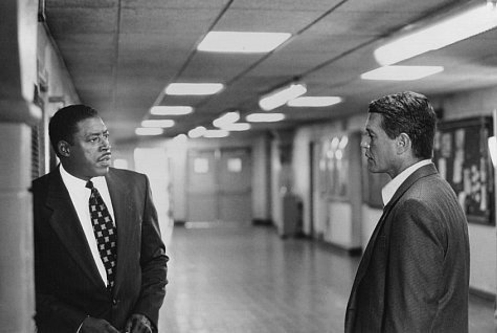 That particular character, played by Dick Tracy‘s William Forsythe in what is surely his worst performance to date, is the only one with any personality. Berenger obviously takes the Hannibal role, but Luis Guzmán’s Rem and Raymond Cruz’s Joey Six are like years-old action figures on the periphery of a brand new playset, and there’s absolutely no room for a B.A. Baracas-type hero in The Substitute. Black characters are either dumb and aggressive, obsequious accessories to a hard-line mentality, or well-meaning but ultimately weak. Even the film’s crime world boss, an exploitative character usually reserved for white actors for the sake of balance, is played by a black actor, and not just any actor, but Ernie Hudson of Ghostbusters fame.