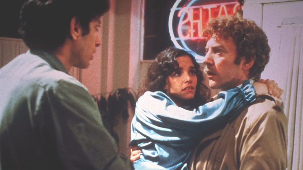 Veteran actor Donald Sutherland plays Bennell as a reasoned skeptic who tries to find an explanation for everything right up to the moment when he realizes he can’t and that things have truly gone bat-shit crazy. It’s a much more subtle approach to the hero compared to how he was played in the 1956 version by Kevin McCarthy, whose final act of resistance is to run into traffic screaming, “They’re already here! You’re next!” McCarthy appears in this film in a clever cameo that has him picking up his performance where it left off in 1956. He runs through the streets of Frisco (Oops, I did it.) screaming unheeded warnings about an alien invasion, then gets clipped by a car. No one seems concerned.