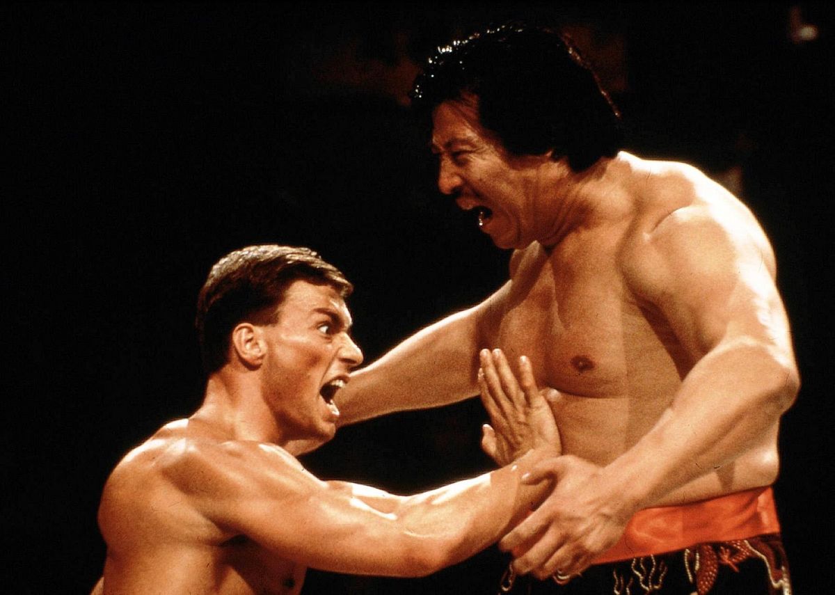 Rafini’s performance is not the only video game comparison to be made here. Bloodsport is a fighting game come to life, a riff on the original Street Fighter that features thinly-sketched characters from around the world, each with their own easily identifiable characteristics. We have the movie’s main boss, Chong-Li (Bolo Yeung), a steroid-pumped killer who rips off Lee’s famous ‘Boards don’t hit back’ line after Van Damme inexplicably makes a brick explode, gaining him instant admission into the (not very well concealed) secret Kumite tournament. There’s a Thai kickboxer, a sumo wrestler, a rough and tumble strongman and a miscellaneous black contender who hops around the place like a simian and even chops coconuts in half in some unnamed jungle that is really just a tree on some random stretch of grass. That particular character, gobsmackingly insensitive in its portrayal, would go down like a lead weight in the 21st century. Even the tournament’s backdrop, a crowd of raucous sadists betting on the lives of human beings, looks like the backdrop of a Street Fighter 2 stage. It’s no wonder Van Damme was later cast in Street Fighter: The Movie.