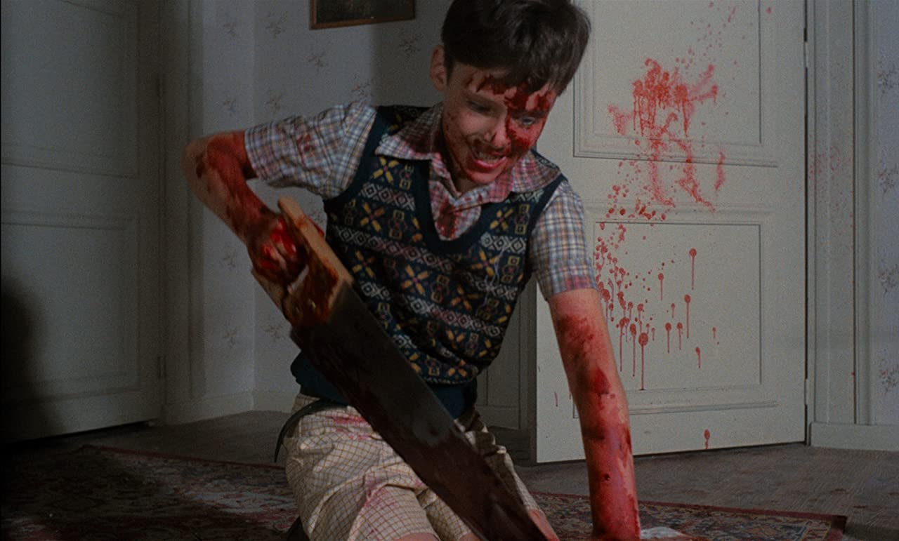 For one thing, events begin forty years prior in 1942, but the jigsaw in question features a naked lady who looks distinctly 80s — unless women in the 40s had a similar penchant for hairspray and all-over tanning. I mean, how would you even get your hands on a jigsaw of a naked woman back then, especially if you were an eight-year old boy? Finding the mutilated corpse of our killer infant’s mother, the local police presume that the bloodsoaked boy hiding in the same room is merely an innocent bystander, the gruesome evidence hardly registering with police and a neighbour lady who quickly stop by to check on the commotion. It’s as if they were expecting to find the room caked in a woman’s innards! “Not to worry, kid,” one of them calmly assures as clumps of viscera drip from the ceiling. One of them even asks for a plastic garbage bag — an insensitive remark, but also an uninformed one as they hadn’t been invented yet. Perhaps he had a few prototypes in his patrol wagon.
