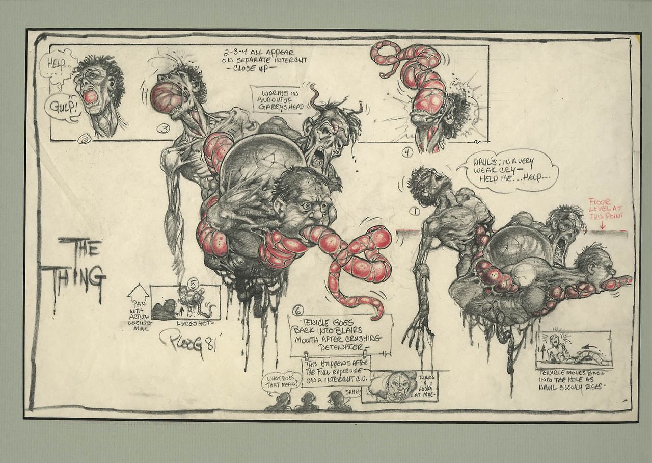 When Bottin joined up with Carpenter and co, pre-production was already underway. Designs for the shapeshifting creature were yet to be thought-up, but Carpenter wasn’t too pleased with Bottin’s initial ideas, finding them a little on the peculiar side. When collaborator Dale Kuipers was forced to leave production for personal reasons, it was suggested that Bottin, who’d just finished working as an assistant to Rick Baker on metamorphic werewolf horror The Howling, collaborate with comic book artist Mike Ploog, someone whose work he was already a big fan of. Since the film’s titular monster had presumably travelled the universe to wind up near the cast’s doomed outpost, it was deemed logical that the creature would retain some of the physical attributes of other alien hosts. Finally, things were beginning to take shape, both figuratively and literally.