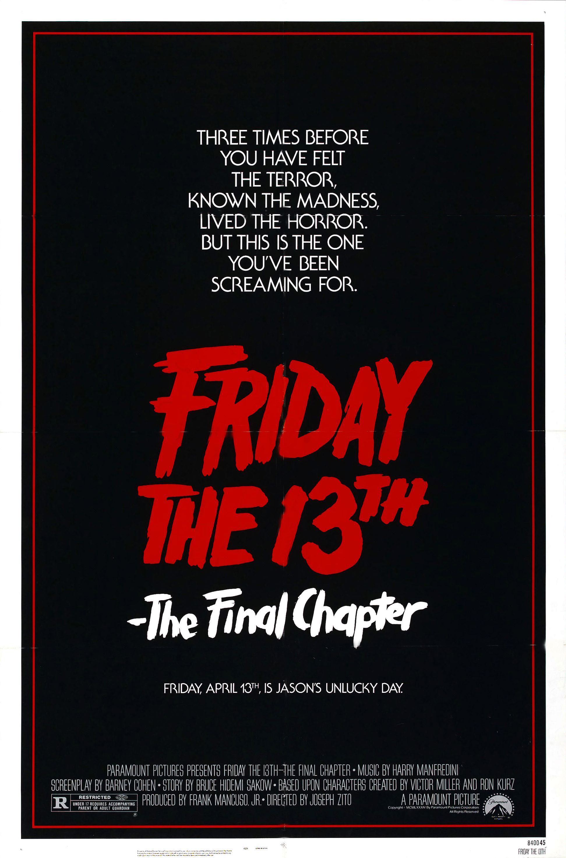 Whatever Paramount’s original intentions, those involved with creating Friday the 13th: The Final Chapter were similarly convinced that the movie would indeed spell the end for Mr Voorhees. According to director Joseph Zito, “We were told — and would believe — that Part IV was going to be THE final chapter. I mean, ‘final chapter’ as in no more Jason, no more Fridays, no more nothing. Therefore, it was going to be a movie about the death of Jason.”