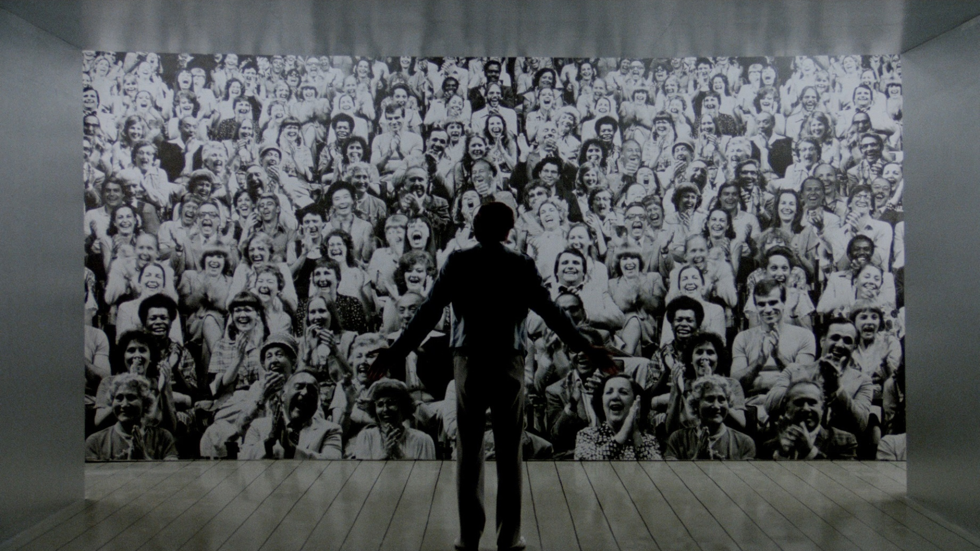 Further levity comes from the way in which the Pupkin character is presented. Despite his deeply troubling obsessions, the kind that a book of hungrily hunted autographs from days past allude to even further, Pupkin is smiling, energetic and dapper, irresistible in his unwavering positivity and sense of ambition, even in his darkest moments. Like many oddball loners Pupkin still resides in his mother’s basement, a shrine to the fantasy allure of superstardom which drowns out his mundane existence, and even the nagging voice of his disapproving mother like the exhilarated audience at a star-studded event, the kind that rings in his imagination on a daily basis. His underground hideaway is basically an office-come-studio, complete with full-sized, immaculately positioned cut-out guests, a residue of his latest and most ambitious target: the top-rated, late night TV host and comedian Jerry Langford (Jerry Lewis). In one particular fantasy, Langford goes to great lengths to compliment Pupkin as the next big thing, pegging him as a talent that he can’t possibly live up to. A moment when the imaginary Langford playfully yet aggressively rubs his hand all over Pupkin’s face, crudely obscuring his features, is an inspired visual insight into our sick protagonist’s screwed-up psyche.
